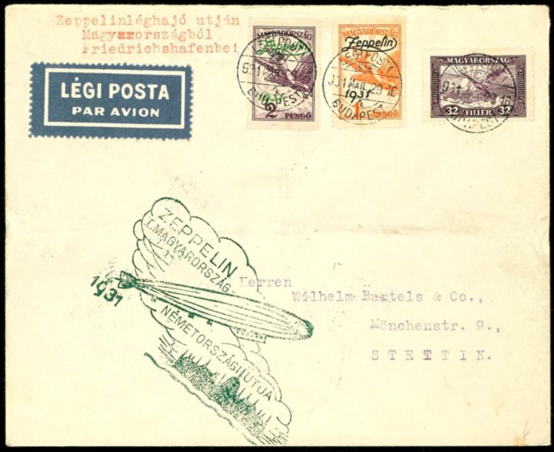 1931, fligth with landing to Hungaria, Hungarian post the return flight, letter with both special stamps and all postmarks, addressed to Stettin, transport traces. (Si.103c) (Image 1)(Image)