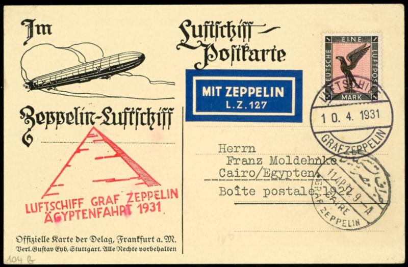 Ägyptenfahrt 1931, Bordpost 10.4., Fotokarte mit 1 Mark Flugpost nach Cairo, Flugstempel und Ankunftsstempel Cairo 11.4. vorderseitig, tadellose Erhaltung.