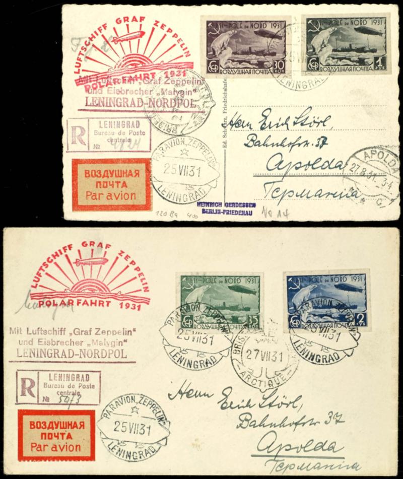 1931, Polar travel, Russian post, handing in for transport Leningrad, card and letter with imperforated Zeppelin stamps with special stamp "PARAVION ZEPPELIN / Leningrad 25. VII. 31" to the ice-breaker Malygion with arrival postmark Malyguin and corresponding Cachets, expertized Dr. Simon (Si.120Ba/Bb) (Image 1)(Image)