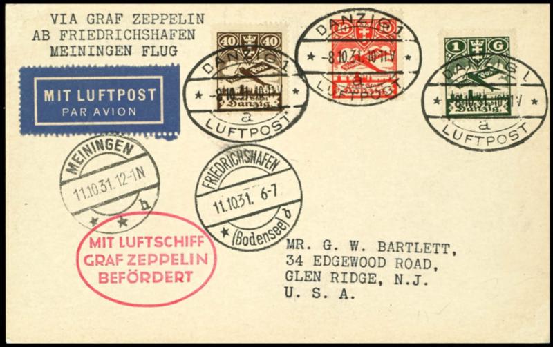 Meiningenfahrt 1931, Karte ab Danzig 8.10. mit 1 Gulden Flugpost in bunter Mischfrankatur, Transit Friedrichshafen 11.10. und Ankunft Meiningen 11.10. dekorativ alle Stempel vorderseitig abgeschlagen, weiter in die USA als seltene Destination für diese Fahrt, tadellos.
