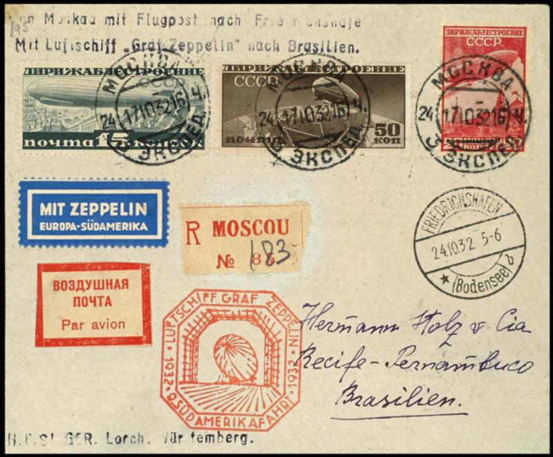 9 Südamerikafahrt 1932, Brief mit russischer Frankatur von Moskau 17 10 32 nach Brasilien über Friedrichshafen 24.10.32, vorderseitig Flugbestätigungsstempel der. 9. Südamerikafahrt 1932, rückseitig Ankunftsstempel Pernambuco 27.X.32