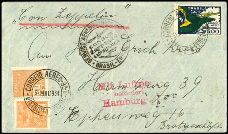 1. Südamerikafahrt 1934, Brasilianische Post, Brasilien - Europa, schwarzer Sonderbestätigungsstempel, sowie Ankunftsstempel Friedrichshafen vom 05.06.1934 auf der Rückseite.