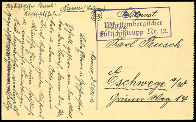 1915 - 1916, three cards from sailors by airship multiples, in detail letter cancel "airship band No 12" from Brussels 19.7.15, "of Wuerttemberg airship band number 12" from Namur 20.4.16 and single circle postmark "weather station of the Air ship harbor Legnica" from Legnica 19.6.16, all superb Photos of this collection(Image 1)(Image)