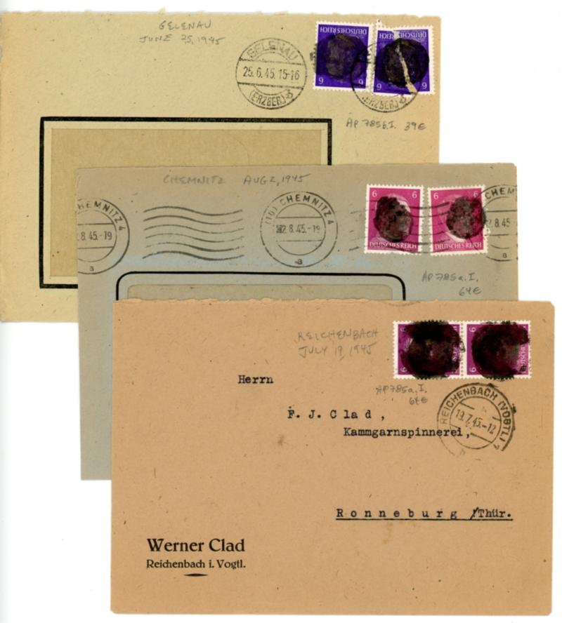 Germany- Allied Occupation Zone - Saxony Covers, 1945 - 5 covers with Hitler head stamps obliterated, all used in Saxony state. All are 12pfg rates, with a few featuring different 6pfg stamps. Pencil notes added to help in the identification. All opened at top. Generally F-VF. Michel €378 (Est $100-150) (Image)