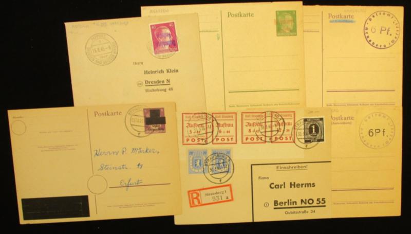 Germany Group of Soviet Zone Covers and Stationery Group 1 - A diverse group of 1945-6 Soviet Zone - East, West, and Province of Saxony covers and postal stationery. Includes 4 unused cards, 26 used items, many with mixed Saxony frankings. Great group! (Est $150-200) (Image)