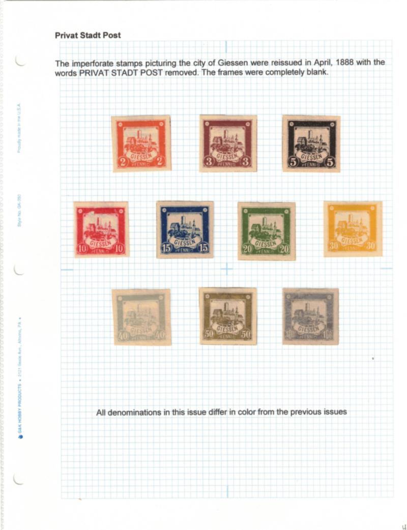Essen, Frankfurt, and Giessen Locals Stamp Collection, 1880's - 3 different local post collection of around 130+ mostly unused stamps and a postal card. Value is pretty much equally divided. Neatly hinge mounted and annotated on 10 quadrille pages. Few flaws but generally fine or better. (Est $150-200) (Image)