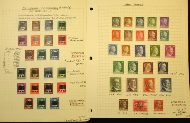 Germany Groups of Locals - High Catalog Potential! - Several sets of Hitler heads with obliterations, overprints, and private creations.Includes Fredersdorf, Kolberg, Löbau , Meissen, Ravensburg, Netzschkau, Reichenbach. Also includes some Saxony unofficial issues/private creations and Czech/Bohemia and Moravia used by Schwarzenberg, Saulgau Württemberg, Chemnitz, Wurzen (Saxony), others. Many have expert's backstamps but would require further investigation and certificates. Still a difficult group to assemble. Generally F-VF. (Est $500-800) (Image)