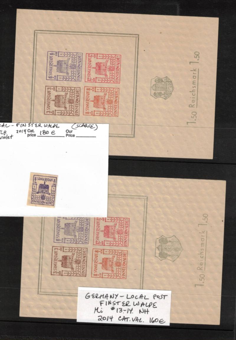 Germany Locals - Finsterwalde Michel 5.b, 13-14 - Scarce Michel 5.b in dark blue violet and souvenir sheets Michel 13-14. With gum (brownish), F-VF. (2014 Michel €360) (Est $60-90) (Image)