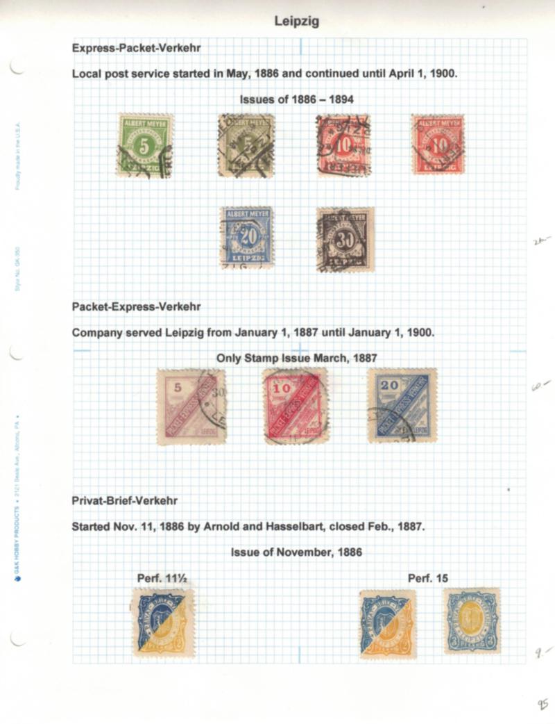 Leipzip and Lipsia Stamps and Postal Stationery, 1880-90's - Local post collection of 45 stamps and a couple postal stationery pieces from two different local post services late 19th century. Neatly written up and hinge mounted to quadrille pages. Generally F-VF with some some faults noted. (Est $90-120) (Image)