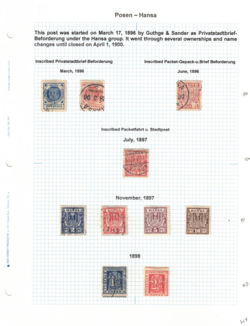 Posen and Strassburg Locals Stamp Collection, 1880-90's - Local post collection of 65 unused and used stamps from two different local post services, late 19th century, and 10 of which are Posen. Neatly written up and hinge mounted to quadrille pages. The one plate proof has a corner faults, otherwise fine or better. (Est $150-200) (Image)