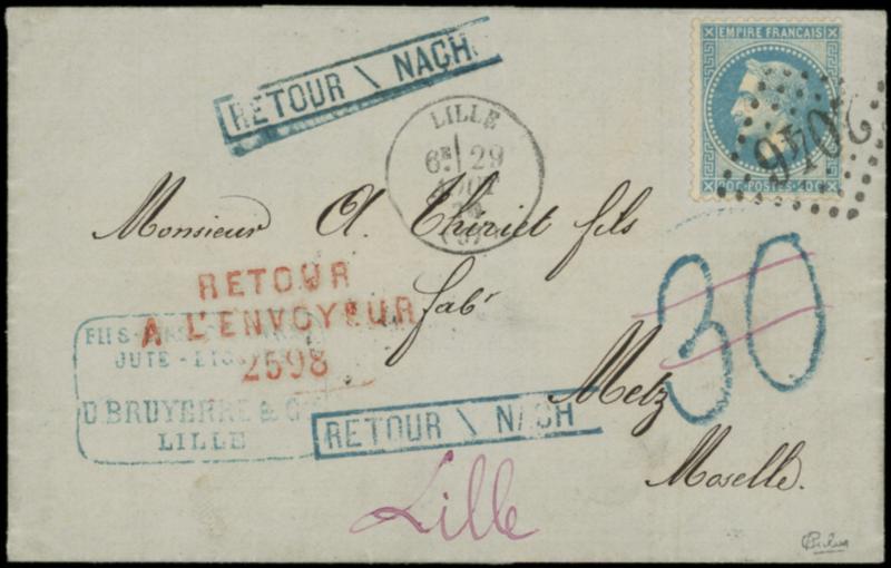 N°29B obl. GC 2046 s. LAC, càd LILLE 29/8/70, pour METZ, "refusé" au verso, griffe RETOUR/NACH, Taxe 30 au tampon annulée, retour à Lille et finalement arr. à METZ 10/4/71, intéressant et TB. C (Image)