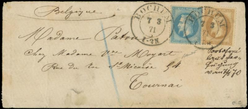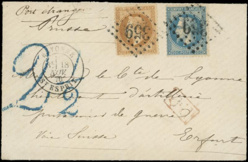 N°28B et 29B obl. GC 359 s. Env., càd BAYONNE St ESPRIT 18/11/70, arr. ERFURT 26/11, transmise par la voie Belge, Amb. PARIS A CALAIS 21/11, "port étranger Prusse" et PP rouge, TAXE Allemande 2 1/2gr. RR, TB (Image)