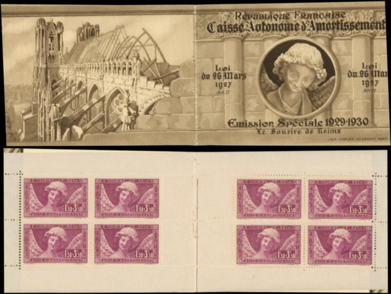 256 Sourire de Reims, 1f.50 + 3f.50 lilas, BLOC de 8 de carnet avec sa couverture, TB (Image)