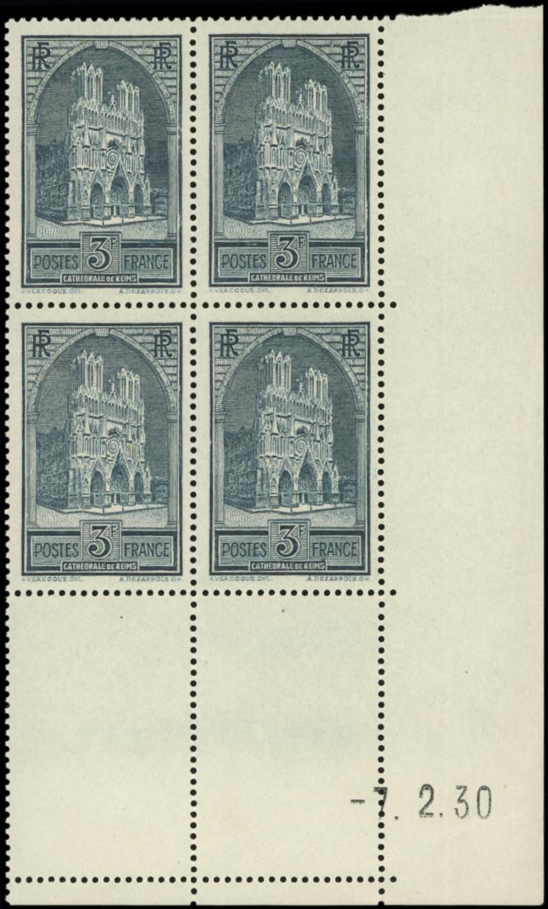 259 Cathédrale de Reims, 3f. ardoise, T I, BLOC de 4 CD 7/2/30, TB (Image)
