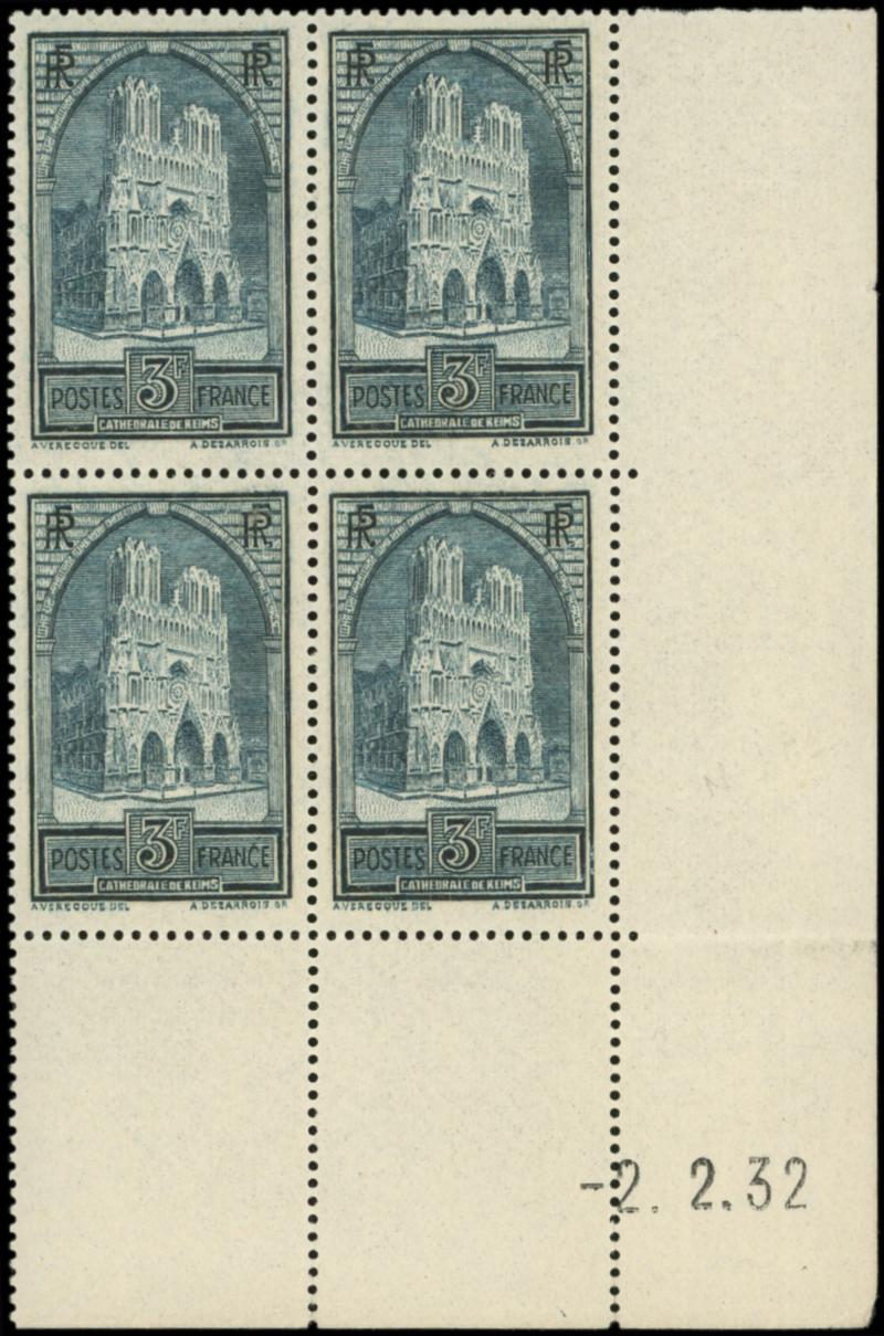 259c Cathédrale de Reims, 3f. ardoise, T IV, BLOC de 4 CD 2/2/32, marge pliée hors timbres, TB (Image)