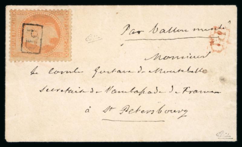 1870, Pli confié de l'Armand Barbes, affranchissement incomplet avec Lauré Y&T n°31 40c oblitéré PD noir sur enveloppe à destination de St Petersbourg (Russie) avec mention manuscrite par Ballon Monté, correspondance datée du 29 septembre 1870 et cachet d'arrivée au dos du 4 octobre (frappe superbe), pièce unique et probablement le seul pli confié à destination de la Russie, certificat Behr (2016), TB. (Image)