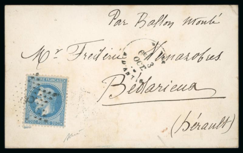 1870, Carte postale par Ballon Monté "L'Armand Barbès" à destination de Bédarieux (Hérault), affranchie Napoléon Lauré Y&T n°29 oblitéré étoile, cachet de départ de Paris rue d'Antin du 3 octobre 1870, sans cachet d'arrivée, certificat Behr (2023), TB. (Image)