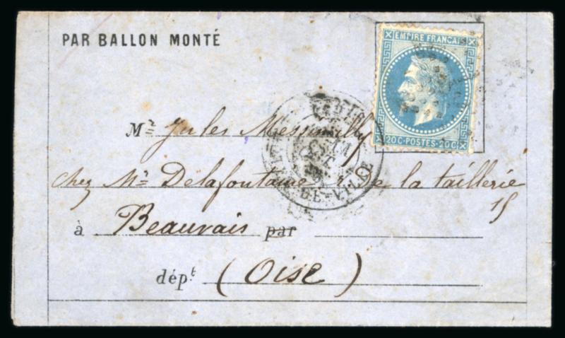 1870, Lettre par Ballon Monté "Le Washington" ou "Le Louis Blanc" sur formule imprimée à destination de Beauvais (Oise), affranchie Napoléon Lauré Y&T n°29 oblitéré étoile, cachet de départ de Paris Hotel de Ville du 11 octobre 1870 et arrivée (au dos) le 13 octobre, certificat Behr (2023), TB. (Image)
