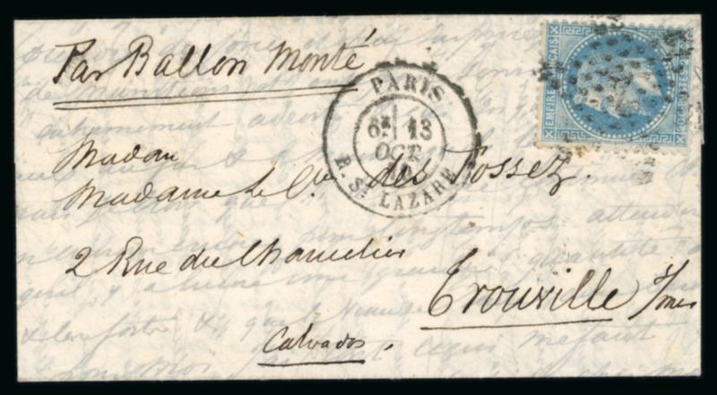 1870, Lettre par Ballon Monté "Le Godefroy Cavaignac" à destination de Trouville (Calvados), affranchie Napoléon Lauré Y&T n°29 oblitéré étoile, cachet de départ de Paris rue St Lazare du 13 octobre 1870 et arrivée (au dos) le 20 octobre, certificat Behr (2023), TB. (Image)
