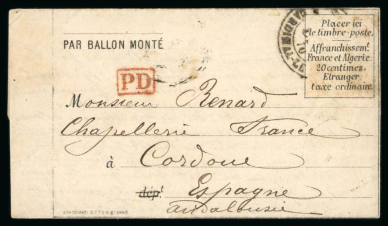 1870, Lettre par Ballon Monté "Le Garibaldi" probable à destination de Cordoue/Cordoba (Espagne) avec correspondance datée du 20 octobre 1870, griffe PD rouge + cachet de départ partiel de Paris rue Cardinal Lemoine (timbre absent), arrivée à Cordoba le 4, TB. (Image)