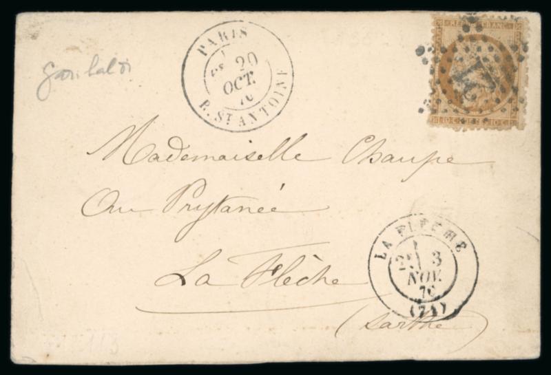 1870, Carte postale par Ballon Monté "Le Garibaldi" à destination de la Flèche (Sarthe), affranchie Siège Y&T n°36 oblitéré étoile, cachet de départ de Paris rue St Antoine du 20 octobre 1870, arrivée le 3 novembre, certificat Behr (2023), TB. (Image)