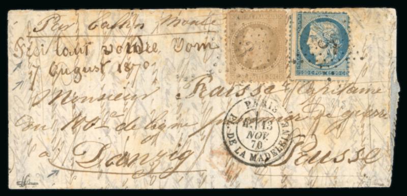 1870, Lettre par Ballon Monté "Le Général Uhrich" à destination d'un prisonnier de guerre à Danzig (Prusse), affranchie à 50c avec Lauré Y&T n°30 + Siège n°37, cachet de départ de Paris Place de la Madeleine du 13 novembre 1870, pas de cachet d'arrivée, TB. (Image)