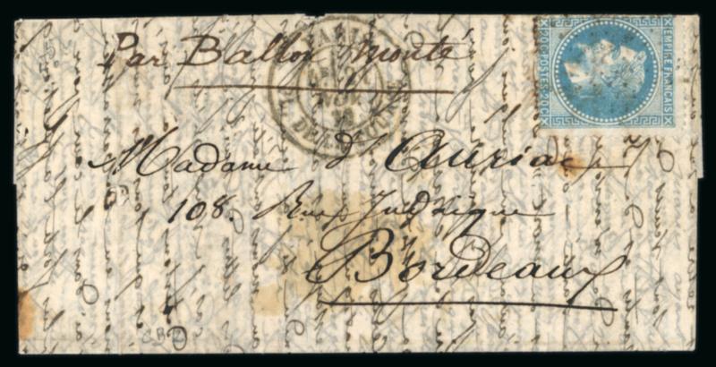 1870, lettre par Ballon Monté "LA VILLE D'ORLÉANS" à destination de Bordeaux, affranchie à 20c avec Napoléon lauré n°29, cachet de départ de Paris Place de la Bourse du 21 novembre 1870. Cachet d'arrivée à Bordeaux du 10 décembre 1870 au dos. TB. (Image)