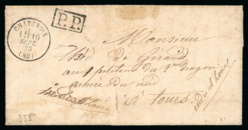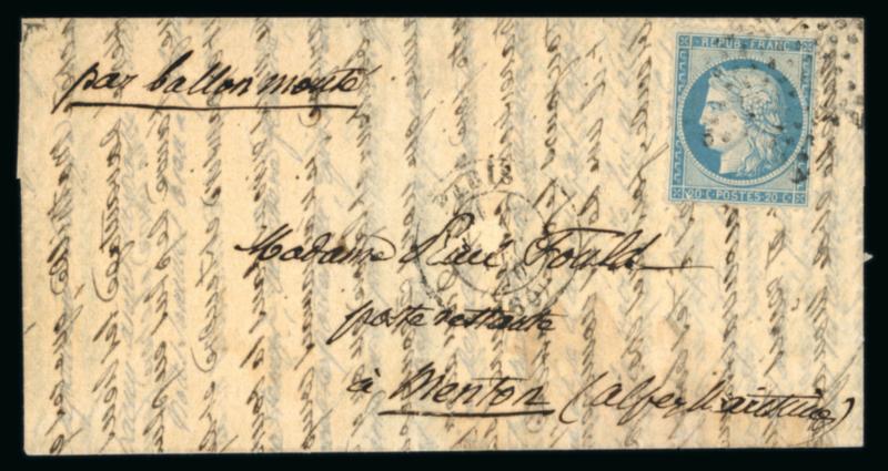 1870-1871, dans un album, belle collection de lettres et documents sur le Siège de Paris, composée en particulier d'une boule de Moulins originaire de Alais (certificat La Postale de 2011), 16 lettres par ballon monté dont une à destination de Moscou ("Le Jacquard" probable), "La Ville de Florence", "Garibaldi", "Fulton", "Tourville", etc., une carte "par ballon non monté" de octobre 1870, une tentative d'entrée, 2 formules neuves "par ballon monté", 1 dépêche-réponse avec n°20 neuf, 3 numéros neufs de la "Gazette des Absents" (n°7, 15 et 21) et quelques pièces complémentaires, TB. (Image)
