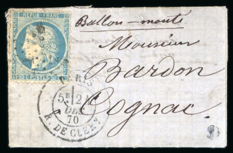 1870, Lettre par Ballon Monté "Le Ville de Paris" à destination de Nice (Alpes Maritimes), affranchie Cérès Siège Y&T n°37 oblitéré étoile, cachet de départ de Paris rue d'Enghien du 13 décembre 1870, sans cachet d'arrivée (le ballon et l'équipage ont été capturés), certificat Behr (2023), TB. (Image)