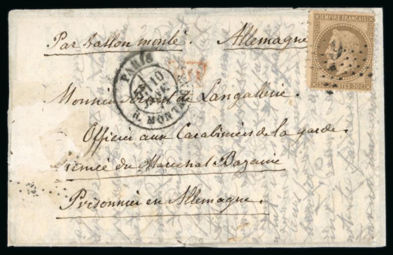 1871, Lettre par Ballon Monté "Le Général Faidherbe" probable à destination d'un officier de l'armée du Général Bazaine en Allemagne, affranchie à 30c avec Lauré Y&T n°30 oblitéré étoile, cachet de départ de Paris rue Montaigne du 10 janvier 1871, pas de cachet d'arrivée, certificat Roumet HP (2019), TB. (Image)