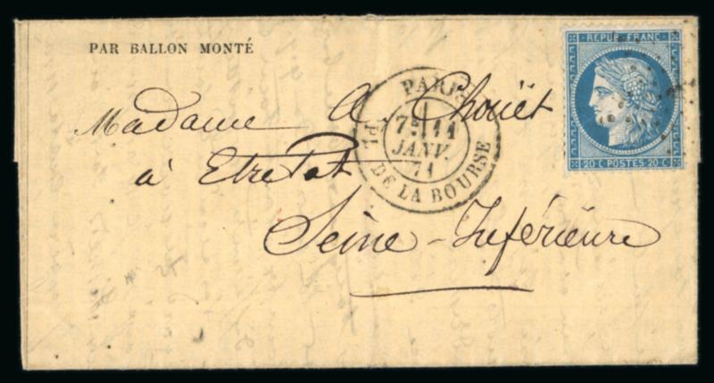 1871, Gazette des Absents n°25 transportée par ballon monté "Le Général Faidherbe" et adressée à Étretat (Seine Maritime), affranchie Cérès Siège Y&T n°37 oblitéré étoile, cad de Paris Place de la Bourse du 11 janvier et arrivée (au dos) le 20 janvier, TB. (Image)
