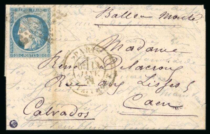 1871, Lettre par Ballon Monté "Le Vaucanson" à destination de Caen (Calvados), affranchie Siège Y&T n°37 oblitéré étoile, cachet de départ de Paris rue Taitbout du 14 janvier 1871, arrivée (au dos) le 18 janvier, certificat Lheritier (1993), TB. (Image)