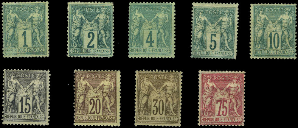 N° 61/71, les 9 valeurs Sage sauf N° 68 et 70 du 1c au 75c (1, 10, 15c NSG) type I B/T.B., pd, tous bon aspect - Photo WEB (Image)