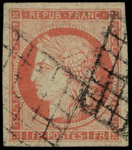 N° 7, 1F vermillon, 4 très grandes marges, très jolie nuance, superbe, qualité exceptionnelle !! signé + certificat Brun + Diena (Image)