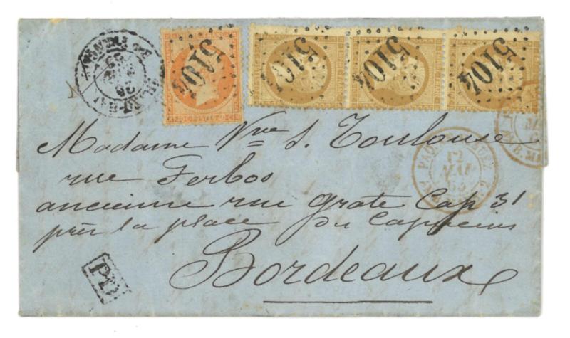 1865 Shanghai (25 Mar) to France. Entire letter, f.w. Napoleon III 10c in vertical stirp of 3 + 40c, in total of 70c, tied by 5104 diamond of dots, alongside with Shanghai French PO cds. Transit England-Suez paquebot (12 May). Arrived Bordeaux (13 May).