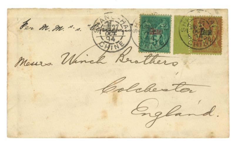 1894 Shanghai (27 Oct) to England, f.w. Peace and Commerce issue ovpt. Chine 5c + 20c, tied by Shanghai French PO cds. Transit French paquebot Ligne N No. 4 (27 Oct). Arrived Colchester (30 Nov).