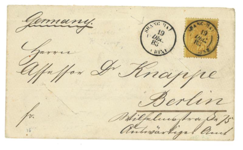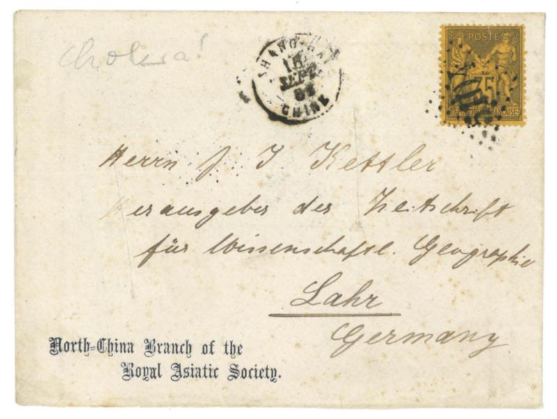 1882 Shanghai (16 Sep) to Germany. North China Branch of the Royal Asiatic Society cover, f.w. Peace and Commerce issue 35c, tied by 5104 dimaond of dots, alongside with Shanghai French PO cds. Showing disinfection slit applied at Naples. Very scarce disinfected covers from Shanghai foreign post.