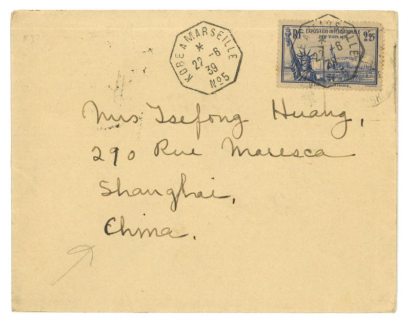 1939 French paquebot (22 Jun) to Shanghai. Messageries Maritimes cover, f.w. New York International Exposition 2.25f, tied by Kobe-Marseille paquebot octagonal d.s. Arrived Shanghai (Jun).