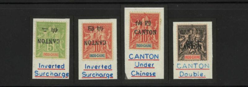 1900s a group of 4 Navigation and Commerce issue and France issue surch “CANTON” variety stamps, showcasing inverted ovpt, misplaced ovpt and other varieties. F-VF.