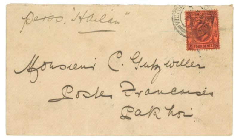 1906 Hong Kong (26 May) to Pakhoi, f.w. Hong Kong KEVII 4c, tied by Victoria cds. Arrived Pakhoi Chinese PO and Pakhoi French PO (1 Jun). Examples of Pakhoi French PO are rather scarce.