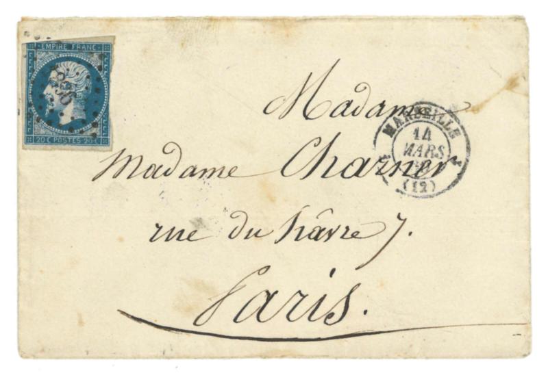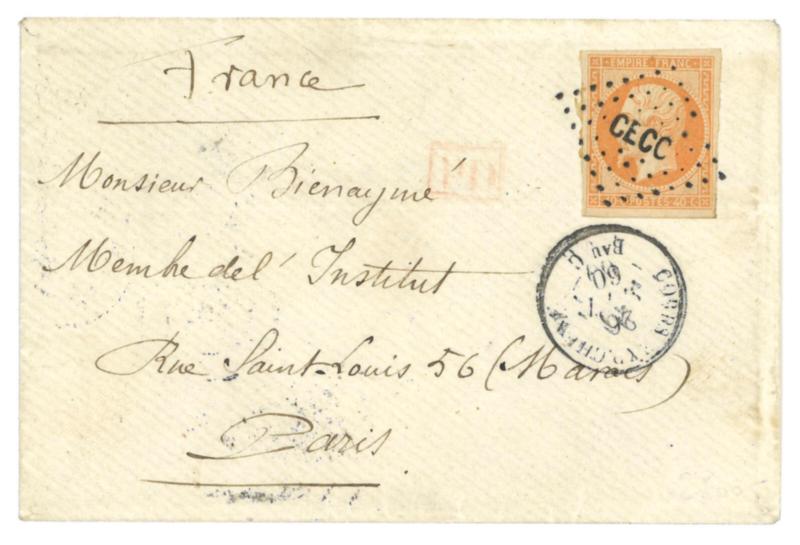 1860 (26 Sep) French military cover to France, f.w. Napoleon III imperf 40c, tied by "CECC" diamond of dots, alongside with framed "PD" cachet and CORPS EXP CHINE / BAU C cds. Arrived France (25 Nov). With certificate.