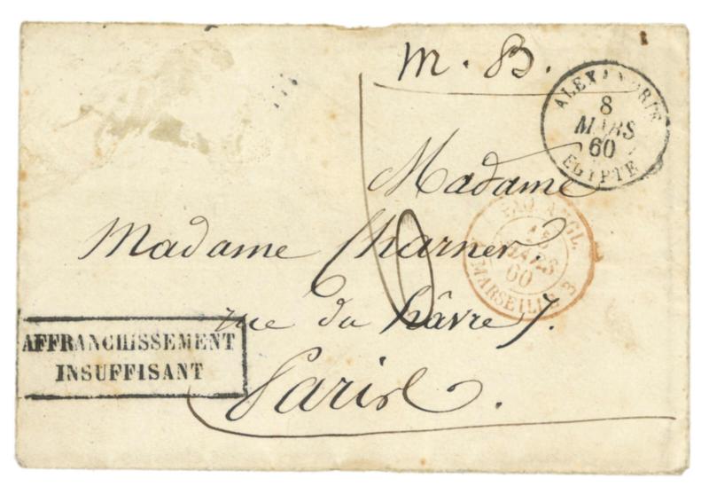 1860 (8 Mar) Corps Expeditionnaire Chine cover from Alexandria to Paris, rated "6", applied with Alexandria origin cds, alongside with "Affranchissement Insufficisant" cachet. Transit Marseille (15 Mar). With original letter instructing the addressee to send letter to the sender via Commandant-in-Chief of French Naval Forces, Shanghai. Historical.