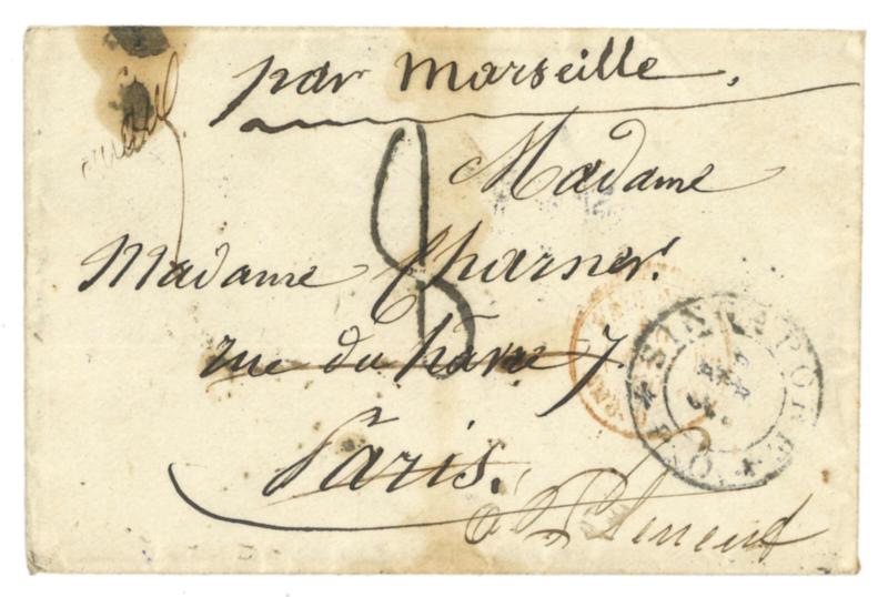 1860 Singapore (4 Apr) to France, sent "par Marselles", rated "8", applied with Singapore cds. Arrived Paris (11 May). With original letter on the expedition to China. With transcripion. Historical piece on the early stage of the 2nd Opium War.