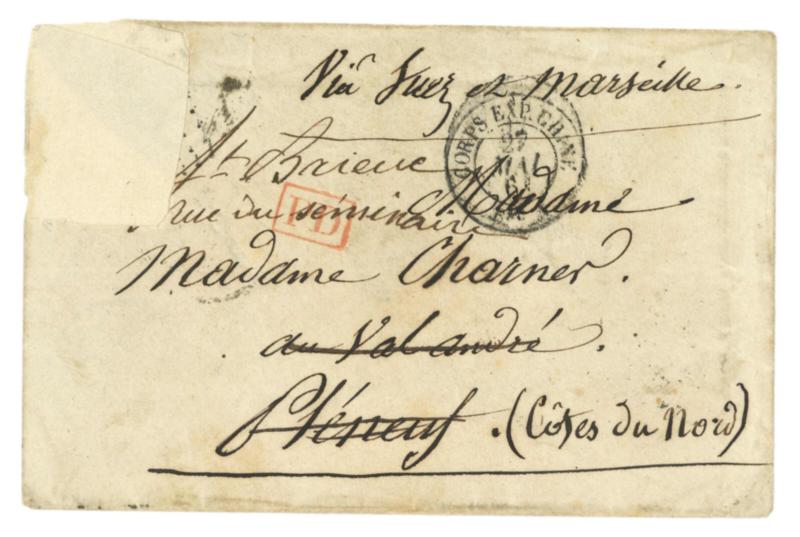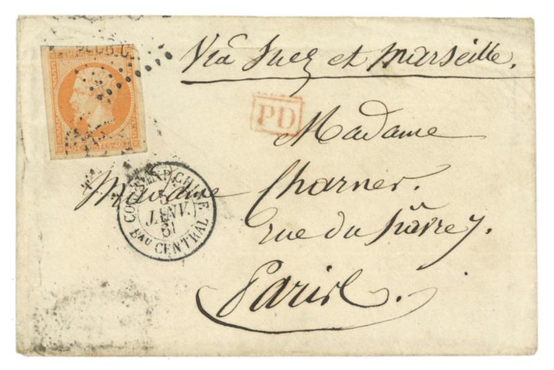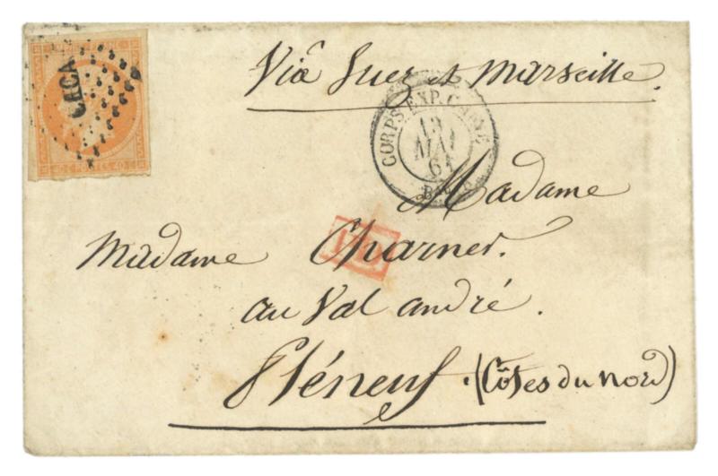1861 French warship Empress Eugenie, Woosung (23 Jan) to France, sent "Via Suez et Marseille", f.w. imperf Napoleon III 40c, tied by "CECB.C" diamond of dots, alongside with framed "PD" cachet. Transit with Corps Expedire Chine / Bau Central (23 Jan) cds . Arrived Paris (15 Mar). With original letter about the French navy in China as well as the battles. Very historical.