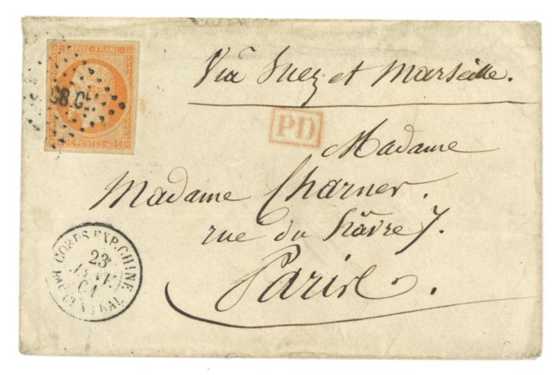 1861 French warship Empress Eugenie, Saigon (14 Jun) to France, sent "Via Suez et Marseille", stamp removed, alongside with framed "PD" cachet. Transit with Corps Exp Chine (27 May). Arrived Paris (16 Jul). With original letter about the fall of Mytho and the French troops were not able to push forward. With transcription. Very historical.