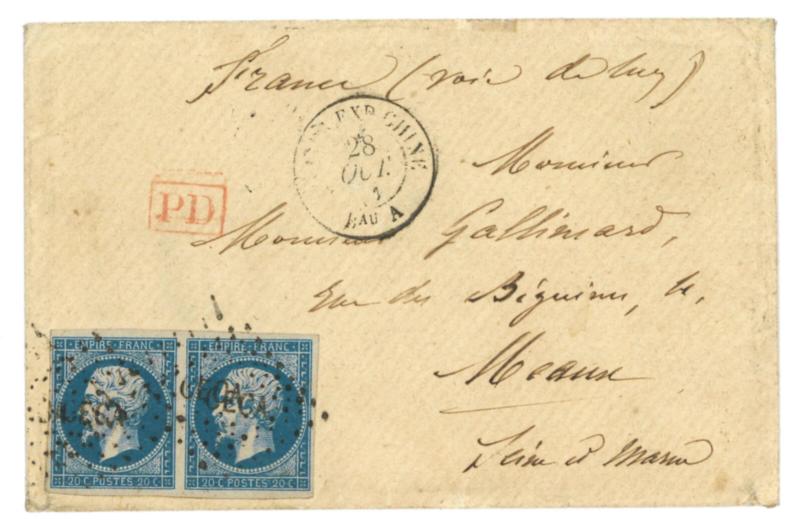 1861 (28 Oct) French military cover to France, f.w. Napoleon III 20c in pair, tied by "CECB.B" diamond of dots, alongside with framed "PD" cachet and CORPS EXP CHINE / BAU A cds. Arrived France (15 Dec). With certificate.