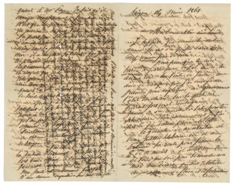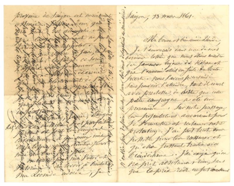 1861 (Feb-Apr) a group of 3 letter sheets by French soldier in Saigon. The content is mostly about the battle of Ky Hoa as well as the negotation with the King of Cochinchina. Historical. All with transcripon. Very historical.