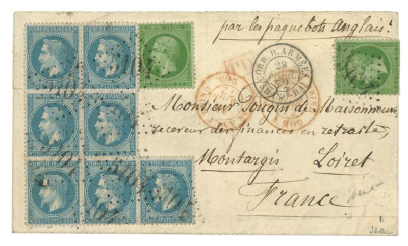 1872 Shanghai (28 Feb) to France, f.w. Napoleon III 2x 5c + 20c in block of 7, in total of 1.5 Fr, tied by 5104 diamond of dots, alongside with "CORR D ARMEES / SHANGHAI" cds., framed PD cachet and "par les paquebots anglais" annotation. Unusually high value franking as the sender requested English paquebot. With certificate. Rare.