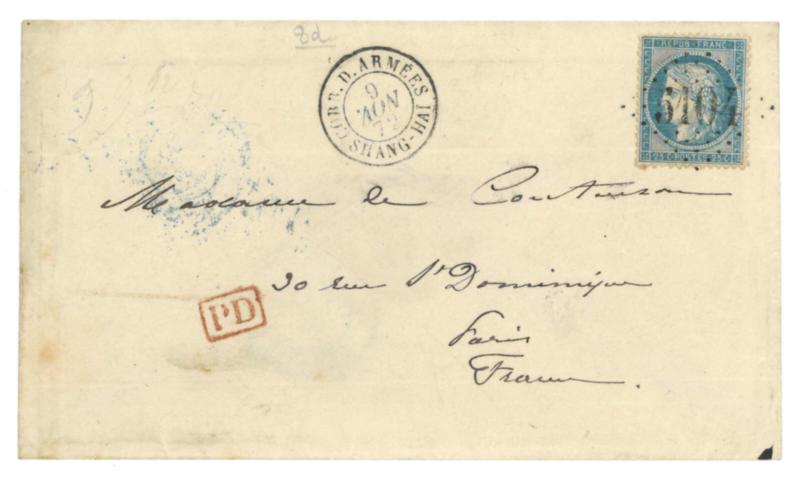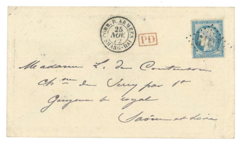 1872 Shanghai (25 Nov) to France, f.w. Ceres 25c, tied by 5104 diamond of dots, alongside with "CORR D ARMEES / SHANGHAI" cds and framed PD cachet. Arrived France (10 Jan). Exceptional early example.