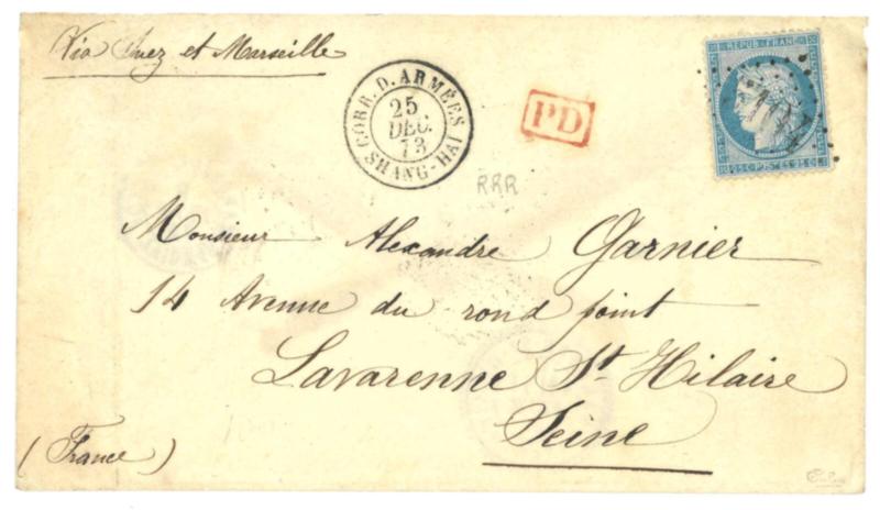 1873 Shanghai (25 Dec) to France, f.w. Ceres 25c, tied by 5104 diamond of dots, alongside with "CORR D ARMEES / SHANGHAI' cds and framed PD cachet. Arrived France (11 Feb). Exceptional early usage.